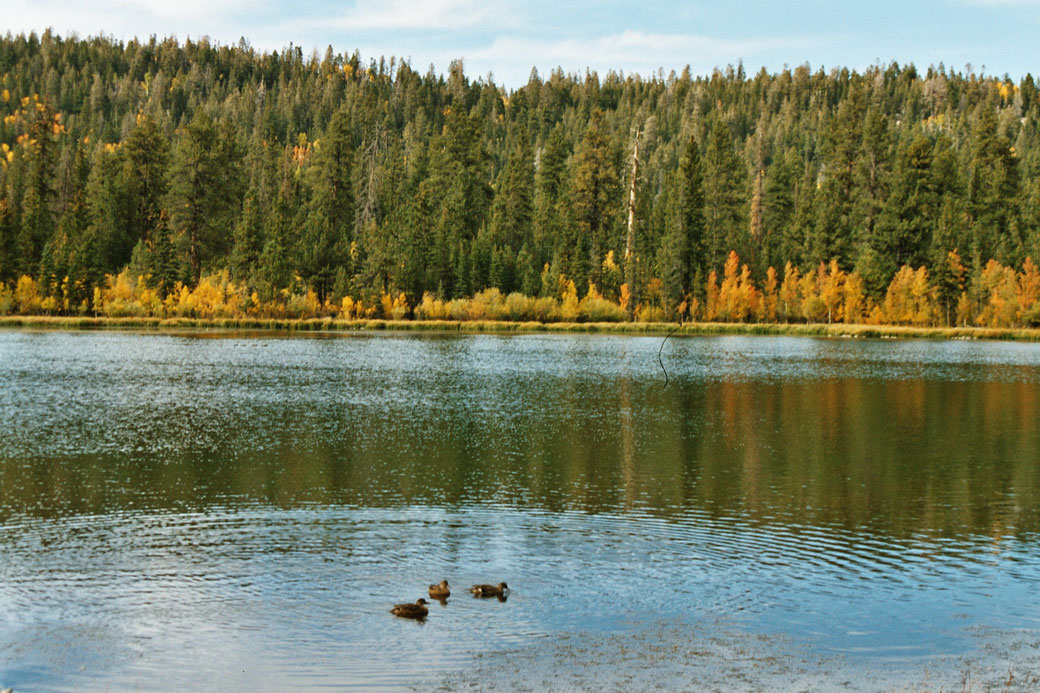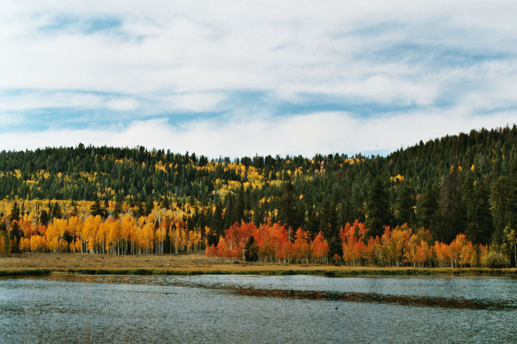 Wir befinden uns immer noch in Utah. Wir sehen ein wunderschönes Waldgebiet, schon herbstlich gefärbtes Laub, rot, gelb, zwischendurch Nadelbäume. Die Sonne beleuchtet die Bäume.