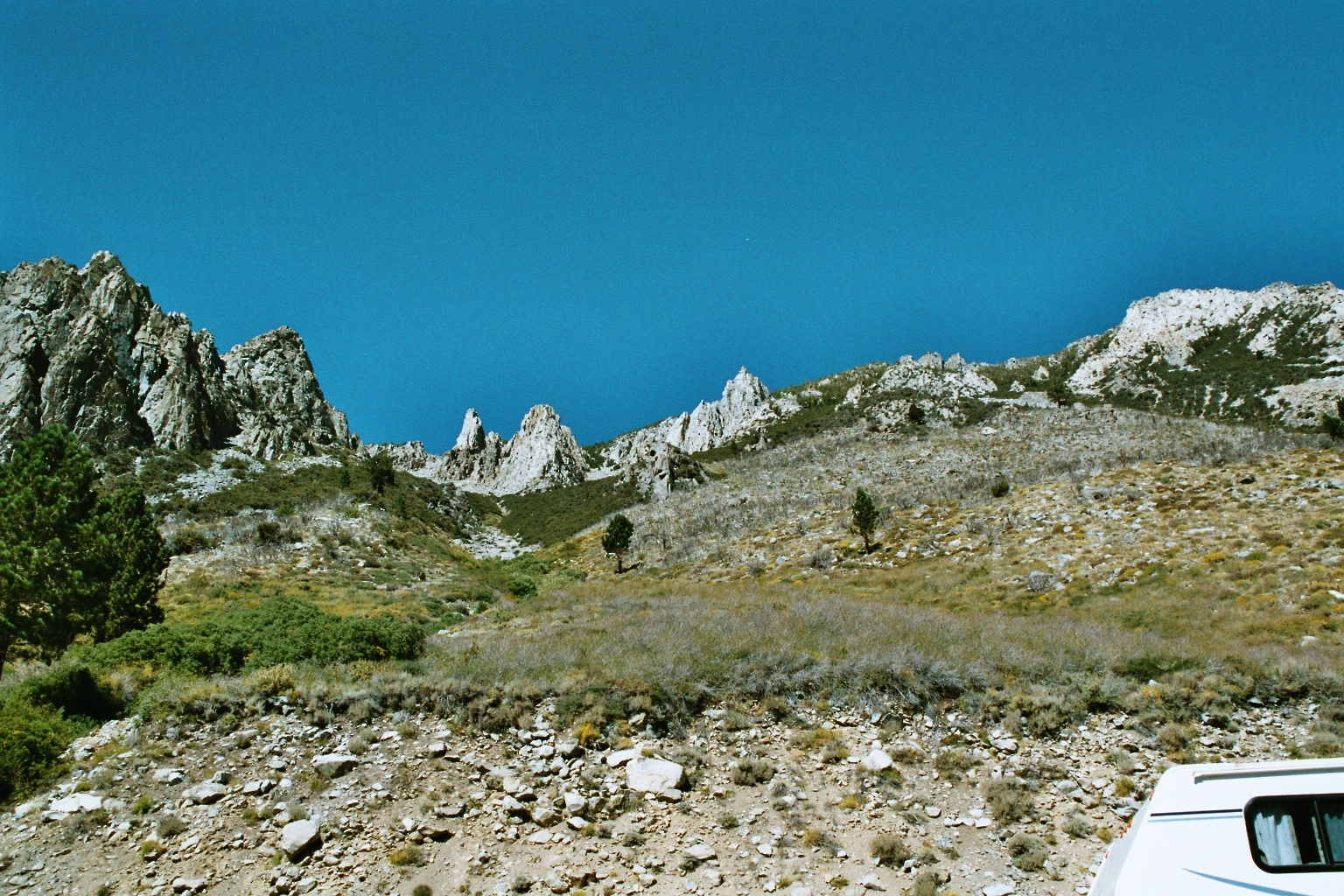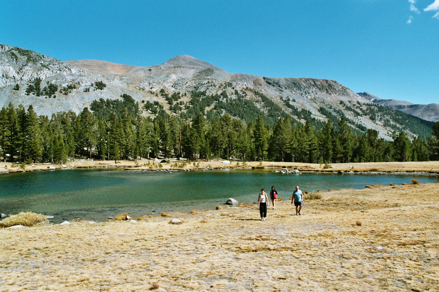 Wir fahren über den Tioga Pass, der im Winter auch gesperrt ist. Wir hatten uns extra vorher informiert, ob er geöffnet ist. Um 13:40 Uhr befinden wir uns auf 8000 Feet, um 14:00 Uhr 9538 Feet. Wir gelangen zu einem riesigen See (dunkelgrün und gleichzeitig tiefblau). Es gibt überall kleine Gebirgsbäche und viele kleine Seen. Letztendlich erreichen wir 9945 Feet.